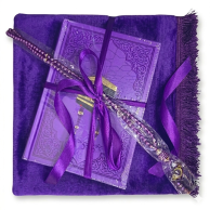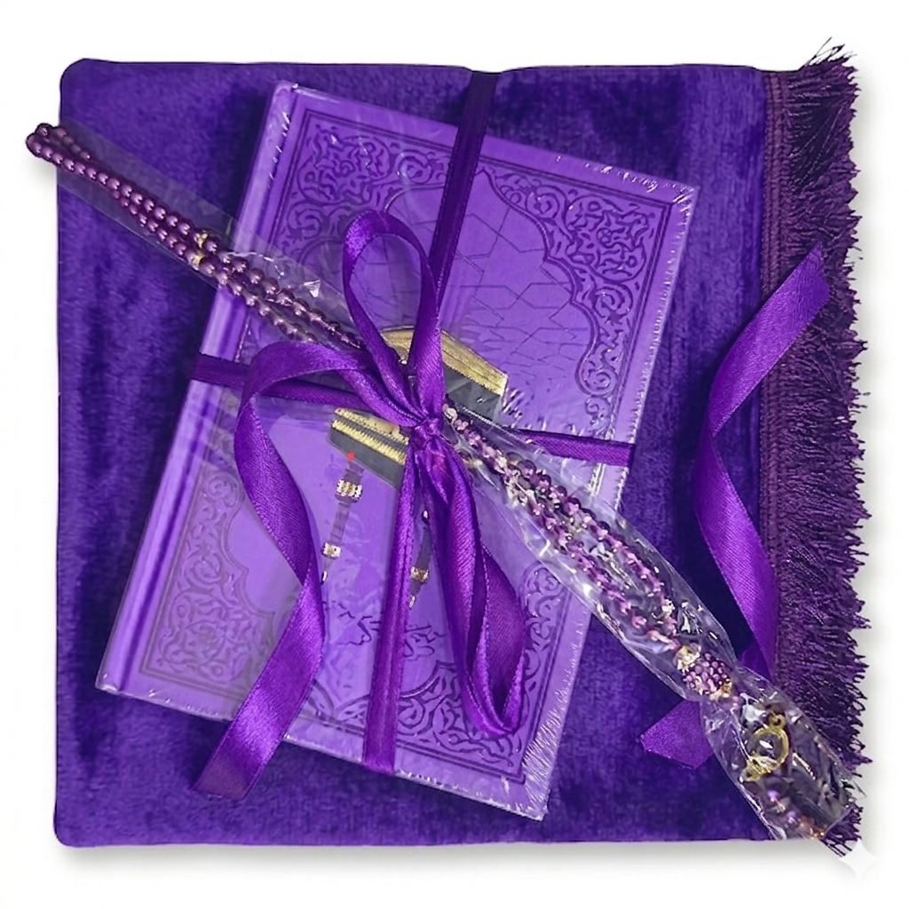 طقم هدية دينية فاخر باللون البنفسجي – مصحف، سجادة مخملية، ومسبحة لؤلؤية