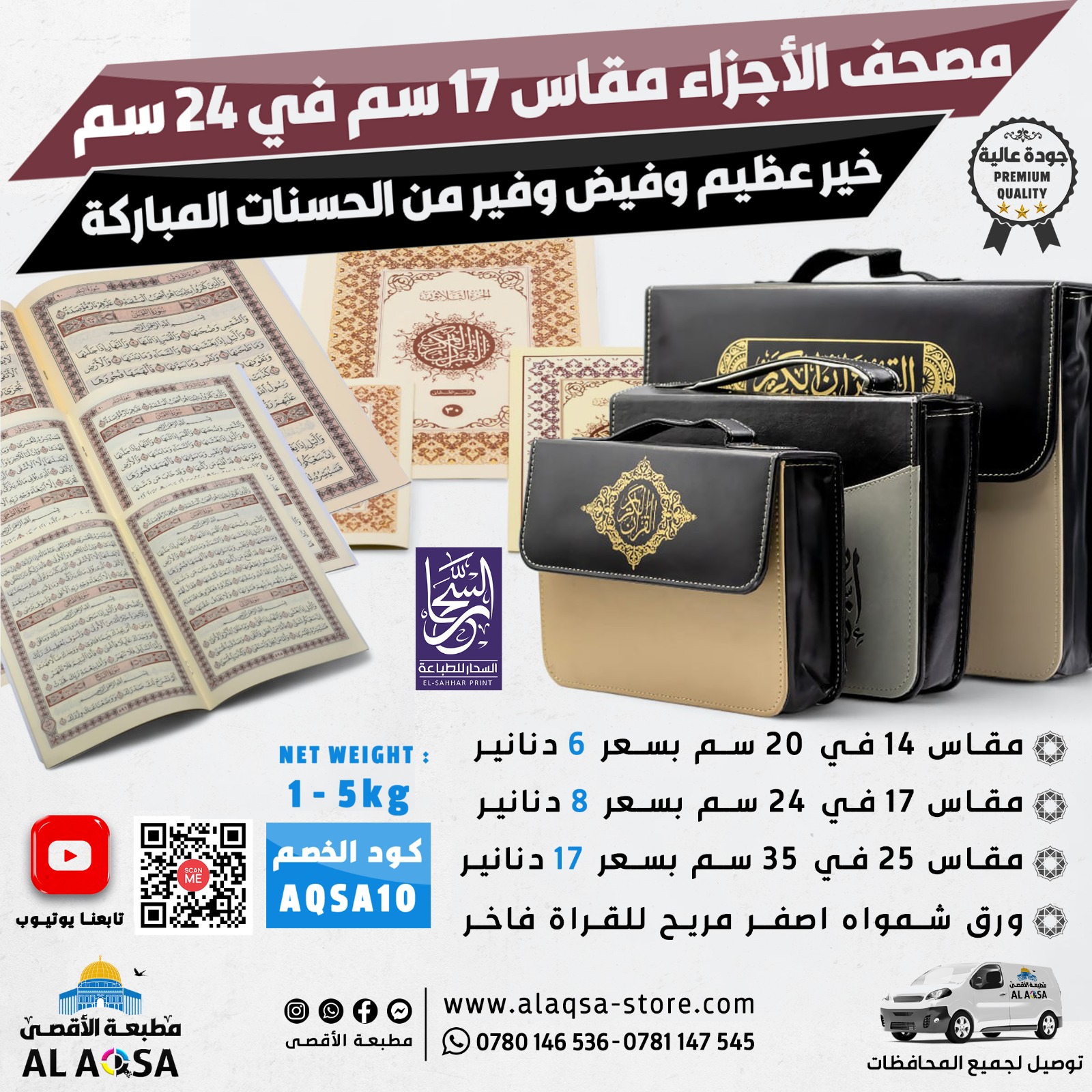 قرآن اجزاء دار السحار للطباعة مقاس صغير و وسط و كبير، مقسم ثلاثون جزءاً ، ورق شمواه كريمي